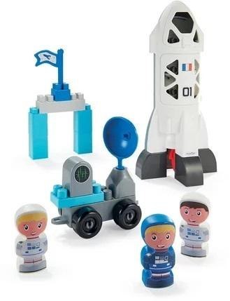 Rakieta kosmiczna z pojazdem do badania kosmicznych. W zestawie dodatkowo 3 figurki astronautów. Wyprodukowane we Francji. Wymiary: 13,5 x 13,5 x 28 cm, 18 m+