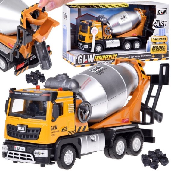 Betoniarka Samochód z dźwiękiem i światłem - to propozycja dla każdego małego budowlańca. Z taką betoniarką zabawa w małego budowniczego nabierze zupełnie nowego wymiaru! Samochód wykonany bardzo realistycznie, z zadbaniem o najdrobniejsze szczegóły. Auto zostało wyposażone w efekty dźwiękowe i świetlne, przez co zabawa nim zyskuje realistyczny wymiar. Pojazd posiada ruchomą beczkę, którą obraca się za pomocą korbki oraz otwieraną kabinę, aby zaglądnąć do silnika.
