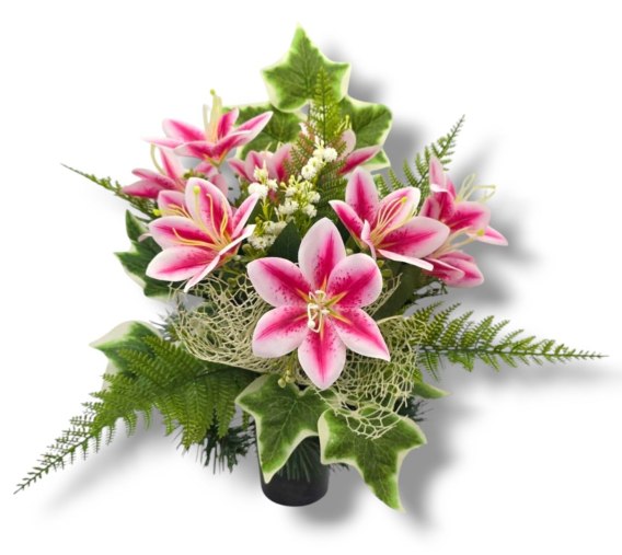 Kompozycje nagrobne z obciążeniem z wysokiej jakości sztucznych kwiatów i roślin.