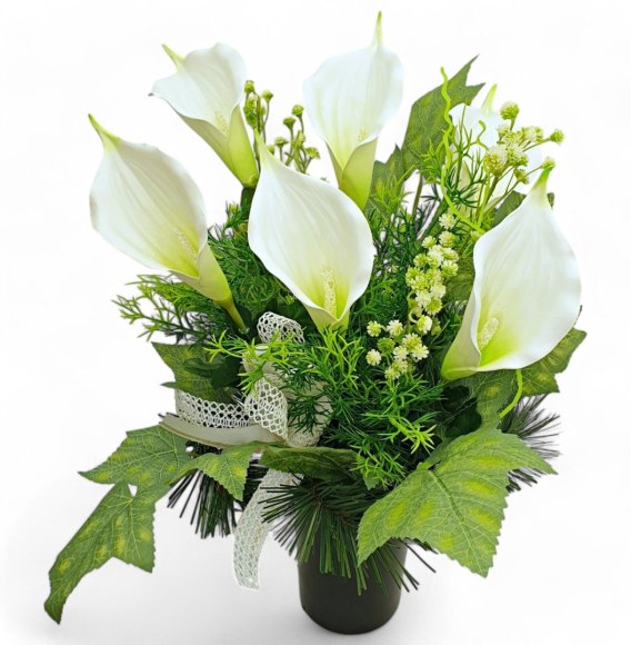 Kompozycje nagrobne z obciążeniem z wysokiej jakości sztucznych kwiatów i roślin.