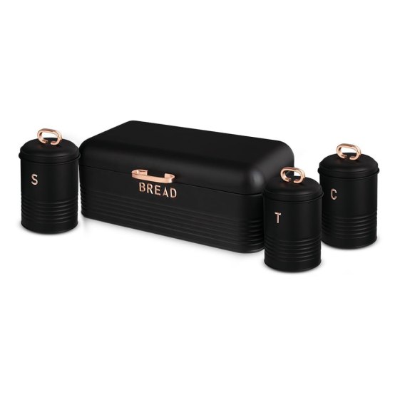 Chlebak stalowy w zestawie z trzema pojemnikami na przyprawy, kawę lub herbatę marki Berlinger Haus z serii Black Rose.