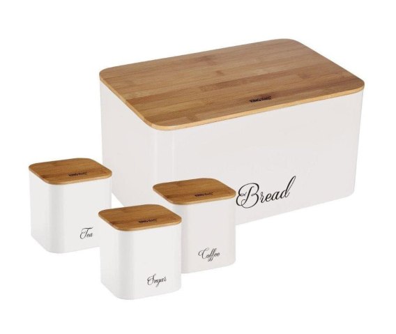Elegancki zestaw w którego skład wchodzi chlebak oraz 3 pojemniki firmy KINGHOFF. Całość wykonana ze stali nierdzewnej, pokryta matowym lakierem. Pokrywa z drewna bambusowego łatwo otwiera się i zamyka oraz jednocześnie pełni funkcję deski do krojenia. Efektowna, praktyczna i zarazem solidna konstrukcja. Pojemniki posiadają szczelne pokrywki (także z drewna bambusowego) tak więc nadają się do szerokiego asortymentu. Podstawowe zastosowanie to herbata, kawa, cukier.