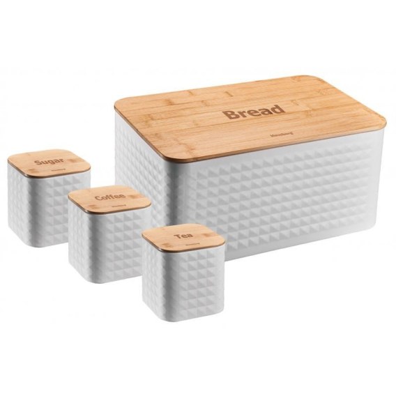 Elegancki zestaw w którego skład wchodzi chlebak oraz 3 pojemniki firmy KLAUSBERG. Całość wykonana ze stali nierdzewnej, pokryta półmatowym lakierem. Pokrywa z drewna bambusowego łatwo otwiera się i zamyka oraz jednocześnie pełni funkcję deski do krojenia. Efektowna, praktyczna i zarazem solidna konstrukcja. Pojemniki posiadają szczelne pokrywki (także z drewna bambusowego) tak więc nadają się do szerokiego asortymentu. Podstawowe zastosowanie to herbata, kawa, cukier.