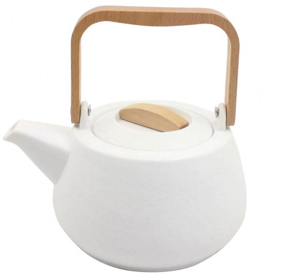 Ceramiczny dzbanek zaparzacz do herbaty lub ziół firmy KASSEL. Wykonany z białej ceramiki z elementami drewnianymi. Pięknie prezentuję się na stole.
