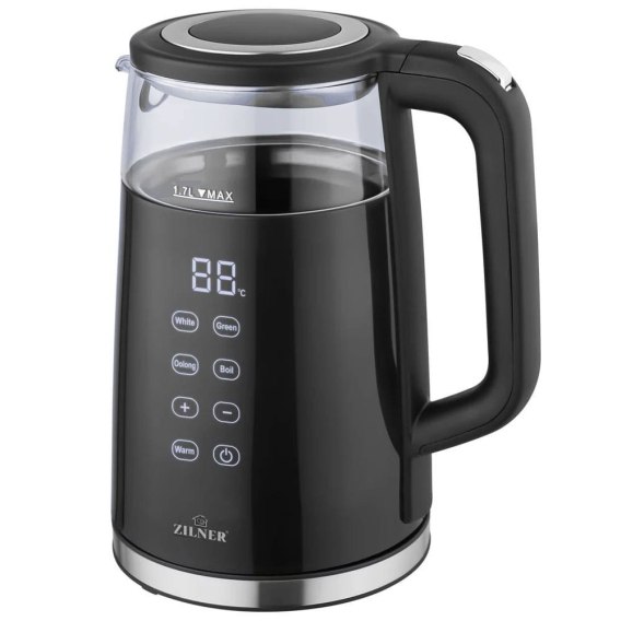 Czajnik elektryczny z regulacja temperatury 1.7L firmy ZILNER to połączenie nowoczesnego designu z wyjątkową funkcjonalnością. Wykonany ze stali nierdzewnej, tworzywa sztucznego i szkła borokrzemowego, zapewnia trwałość i estetykę. Korpus wykonany z tworzywa sztucznego w eleganckim połyskującym czarnym kolorze "piano" zaś wewnętrzna część czajnika wykonana ze szkła borokrzemowego oraz stali nierdzewnej. Wyposażony w duży, dotykowy cyfrowy panel sterowania LED, który umożliwia łatwe korzystanie i kontrolowanie temperatury. Dzięki możliwości ustawienia temperatury 13 poziomach, można dostosować go do różnych potrzeb. Funkcja podtrzymywania temperatury działa przez dwie godziny, a nastepnie automatycznie sie wyłącza zapobiegając tym niepotrzebnym stratom energii. Dodatkowo, łatwość czyszczenia oraz uchylana pokrywa sprawiają, że jest to praktyczne i eleganckie urządzenie do każdej kuchni.