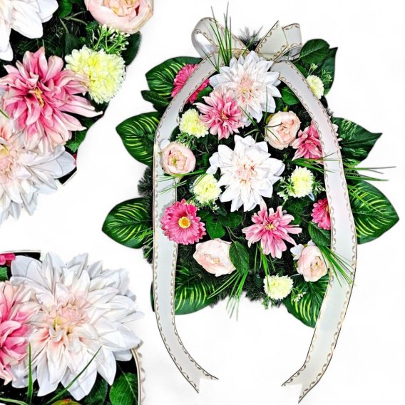 Kwiaty są integralnym elementem ceremonii ostatniego pożegnania lub jako element ozdobienia grobu, łącząc szacunek i elegancję w jednym, starannie wykonanym projekcie. Podkład wieńca jest wykonany z zielonych, gęsto splecionych gałązek PCV, które są zarówno trwałe, jak i estetyczne, podkreślając kolorystykę wiązanki.