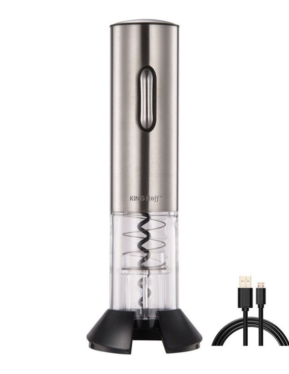 Korkociąg elektryczny do wina KINGHOFF którym bez problemu otworzysz każdą zakorkowaną butelkę. Zasilany na akumulator (ładowanie USB) i bezprzewodowy, co pozwala Ci swobodnie z niego korzystać, bez potrzeby podłączania go do stałego źródła zasilania. Do zestawu dołączony jest również obcinacz do folii będący jednocześnie podstawką na blat stołu.