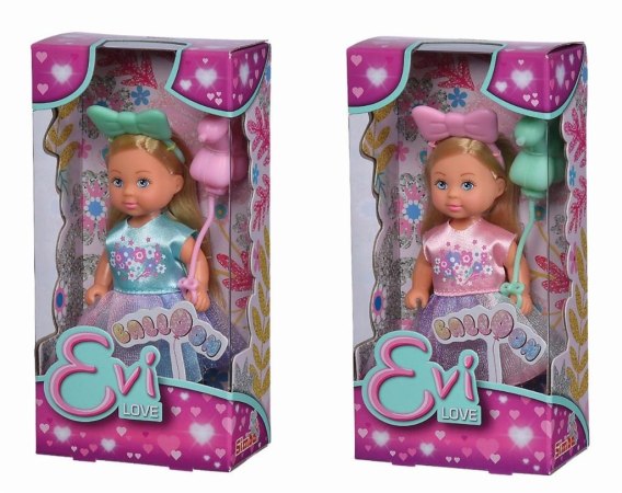 Laleczka Evi w uroczym, pastelowym stroju, wdzięku dodaje tiulowa spódniczka i dopasowana kokarda na głowie oraz balon w rączce, wysokość lalki: 12 cm, 3l+