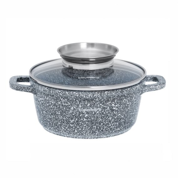 Garnek KLAUSBERG pokryty ceramiczną marmurową powłoką nieprzywierającą. Wyposażony w pokrywkę szklaną z uchwytem "Aroma Knob" w którym umieszczono dozownik oleju, dzięki któremu podczas gotowania lub duszenia można podawać olej lub płynne przyprawy. Garnki z tej serii wykonane ze stopu aluminium posiadają indukcyjne ferromagnetyczne dno. Są przystosowane do współpracy z każdym rodzajem kuchni, włącznie z indukcyjną.