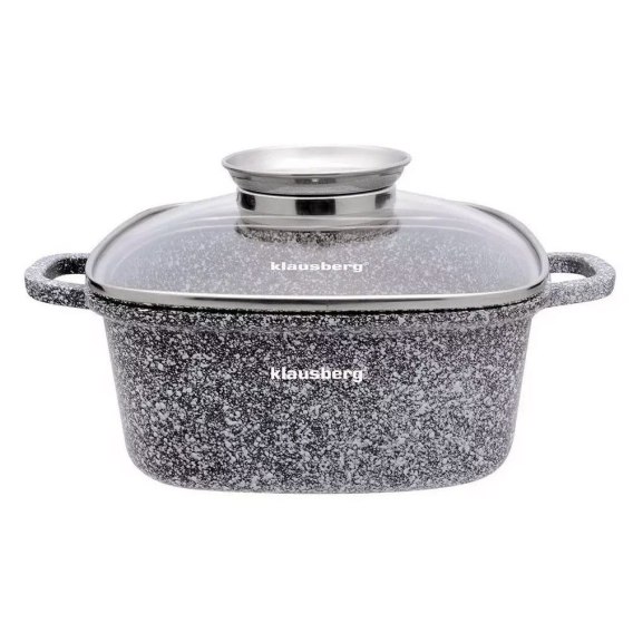 Garnek KLAUSBERG pokryty ceramiczną marmurową powłoką nieprzywierającą. Wyposażony w pokrywkę szklaneą z uchwytem Aroma Knob w którym umieszczono dozownik oleju, dzięki któremu podczas gotowania lub duszenia można podawać olej lub płynne przyprawy. Garnki z tej serii wykonane ze stopu aluminium posiadają indukcyjne ferromagnetyczne dno. Są przystosowane do współpracy z każdym rodzajem kuchni, włącznie z indukcyjną.