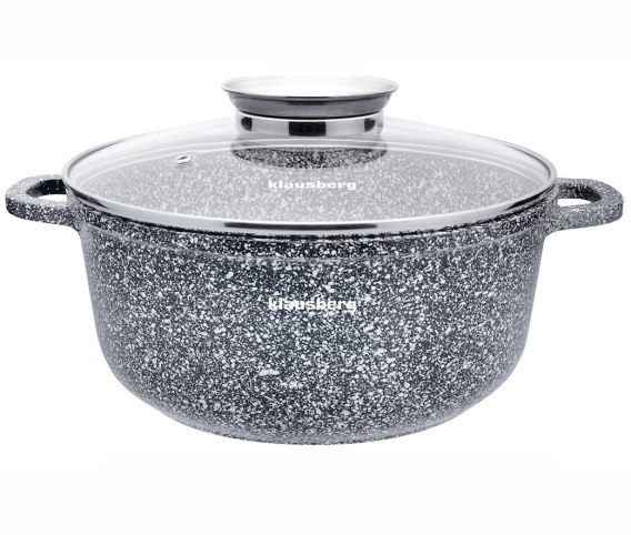 Garnek KLAUSBERG pokryty ceramiczną marmurową powłoką nieprzywierającą. Wyposażony w pokrywkę szklaną z uchwytem Aroma Knob w którym umieszczono dozownik oleju, dzięki któremu podczas gotowania lub duszenia można podawać olej lub płynne przyprawy. Garnki z tej serii wykonane ze stopu aluminium posiadają indukcyjne ferromagnetyczne dno. Są przystosowane do współpracy z każdym rodzajem kuchni, włącznie z indukcyjną.
