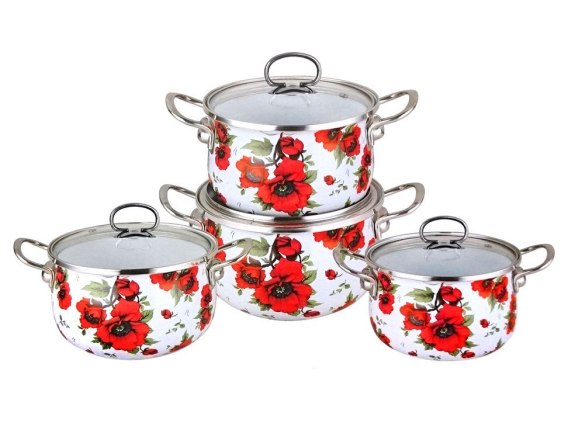 8 ELEMENTOWE GARNKI EMALIOWANE WYKONANE ZE STALI WĘGLOWEJ. Nowoczesne garnki pokryte obustronnie wysokiej klasy żaroodporna emalią oraz przystosowane są do wszystkich rodzajów kuchenek i płyt, także na kuchni INDUKCYJNEJ.