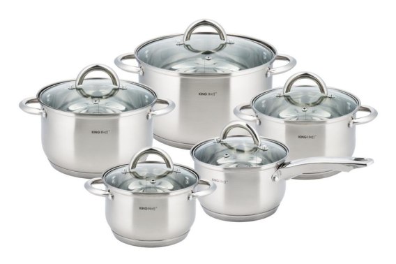 KOMPLET GARNKÓW 10 ELE. KINGHOFF . Komplet wykonany ze stali chromowo-niklowej 18/10. Stal nierdzewna chromowo-niklowa z której wykonany jest cały komplet jest nierdzewna, wytrzymała i długowieczna. Zastosowany materiał jest nie tyko najlepszy z możliwych, ale także świetnie się prezentuje i jest wyjątkowo łatwy w czyszczeniu oraz posiada właściwości bakteriobójcze. Naczynia w tym komplecie są delikatnie matowane (INOX). Ferromagnetyczne 5-warstwowe dno akutermiczne (5mm) z warstwą aluminiową gwarantuje doskonały rozdział i magazynowanie ciepła. Wszystkie garnki z kompletu można używać na wszystkich rodzajach kuchenek, również nakuchni indukcyjnej. Nitowane uchwyty (polerowane). Na wewnętrznej stronie każdego garnka znajduje się praktyczna miarka. Przyzwoite, umiarkowanie ciężkie garnki działające na indukcji, za bardzo atrakcyjną cenę.