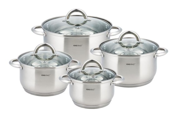 KOMPLET GARNKÓW 8 ELE. KINGHOFF . Komplet wykonany ze stali chromowo-niklowej 18/10. Stal nierdzewna chromowo-niklowa z której wykonany jest cały komplet jest nierdzewna, wytrzymała i długowieczna. Zastosowany materiał jest nie tyko najlepszy z możliwych, ale także świetnie się prezentuje i jest wyjątkowo łatwy w czyszczeniu oraz posiada właściwości bakteriobójcze.  Naczynia w tym komplecie są delikatnie matowane (INOX). Ferromagnetyczne 5-warstwowe dno akutermiczne (5mm) z warstwą aluminiową gwarantuje doskonały rozdział i magazynowanie ciepła. Wszystkie garnki z kompletu można używać na wszystkich rodzajach kuchenek, również nakuchni indukcyjnej. Nitowane uchwyty (polerowane). Na wewnętrznej stronie każdego garnka znajduje się praktyczna miarka. Przyzwoite, umiarkowanie ciężkie garnki działające na indukcji, za bardzo atrakcyjną cenę.