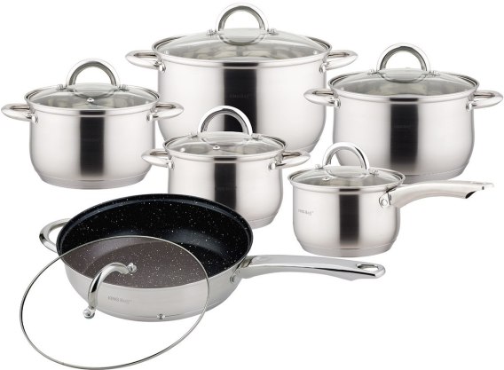 KOMPLET GARNKÓW 12 ELE. KINGHOFF z PATELNIĄ Z POWŁOKĄ GRANITOWĄ. Komplet wykonany ze stali chromowo-niklowej 18/10. Stal nierdzewna chromowo-niklowa z której wykonany jest cały komplet jest nierdzewna, wytrzymała i długowieczna. Zastosowany materiał jest nie tyko najlepszy z możliwych, ale także świetnie się prezentuje i jest wyjątkowo łatwy w czyszczeniu oraz posiada właściwości bakteriobójcze. Naczynia w tym komplecie są delikatnie matowane (INOX). Ferromagnetyczne 5-warstwowe dno akutermiczne (5mm) z warstwą aluminiową gwarantuje doskonały rozdział i magazynowanie ciepła. Wszystkie garnki z kompletu można używać na wszystkich rodzajach kuchenek, również nakuchni indukcyjnej. Nitowane uchwyty (polerowane). Na wewnętrznej stronie każdego garnka znajduje się praktyczna miarka. Przyzwoite, umiarkowanie ciężkie garnki działające na indukcji, za bardzo atrakcyjną cenę.