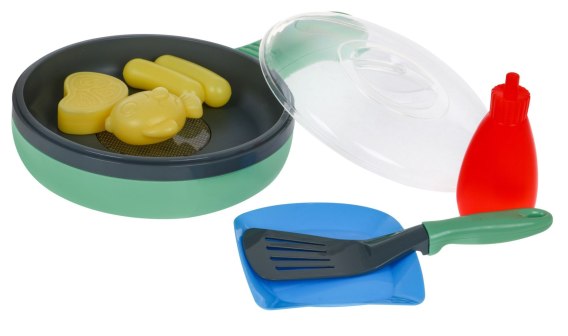Interaktywna patelnia z funkcją smażenia to propozycja dla dzieci od 3-go roku życia. Zabawka posiada efekty dźwiękowe i świetlne. Podczas „smażenia" na patelni słychać odgłosy smażenia a potrawy zmieniają kolor. Po środku patelni świecą się trzy niebie diody odpowiedzialne za podgrzanie atrap produktów. Kiedy produkty są już „usmażone", patelnia wyłącza się. Zabawka zasilana bateriami typu 2 x AAA 1,5V (brak w zestawie)