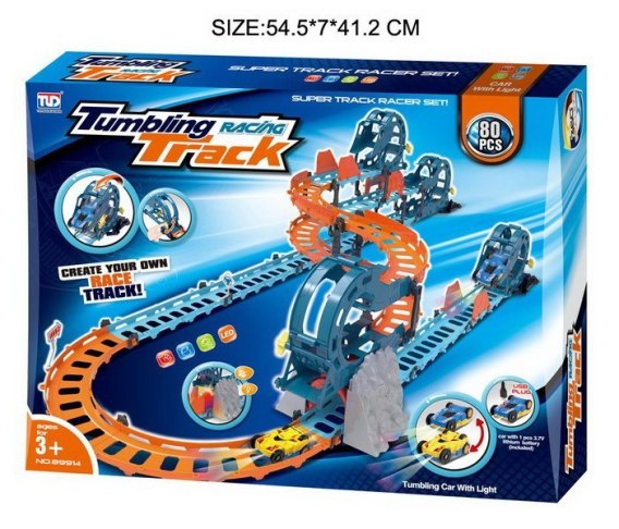 Ekstremalny wielopoziomowy tor wyścigowy z funkcją dźwięku i światła to propozycja dla dzieci powyżej trzeciego roku życia. Do zestawu dołączono jeden dwustronny pojazd zasilany akumulatorem typu 3,7V (zestaw zawiera). Samochód mknący po torze wykonuje obrót o 360 stopni, posiada światełka z przodu i gumowe tylne opony. Ładowany jest przez port USB.