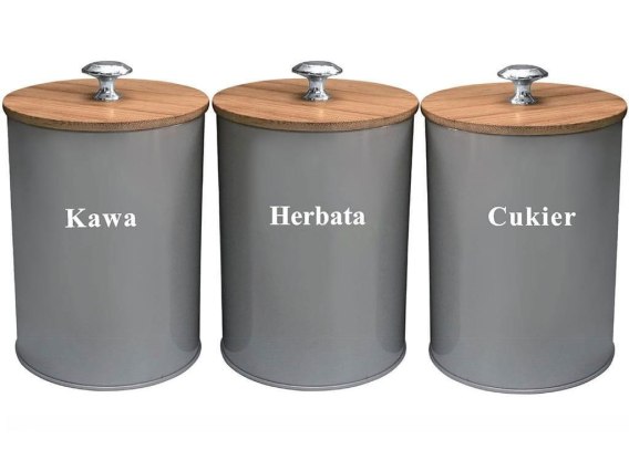Zestaw 3 pojemników do przechowywania herbaty, kawy oraz cukru. Pojemniki wykonane z lakierowanej stali nierdzewnej. Każdy pojemnik posiada szczelną pokrywkę, dzięki czemu do pojemnika nie dostaje się powietrze i kawa czy herbata nie wietrzeje.