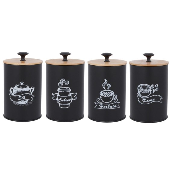 Zestaw 4 pojemników do przechowywania herbaty, kawy, cukru oraz soli. Pojemniki wykonane z lakierowanej stali nierdzewnej. Każdy pojemnik posiada pokrywkę, dzięki czemu do pojemnika nie dostaje się powietrze i kawa czy herbata nie wietrzeje. Napisy na pojemnikach w języku polskim.