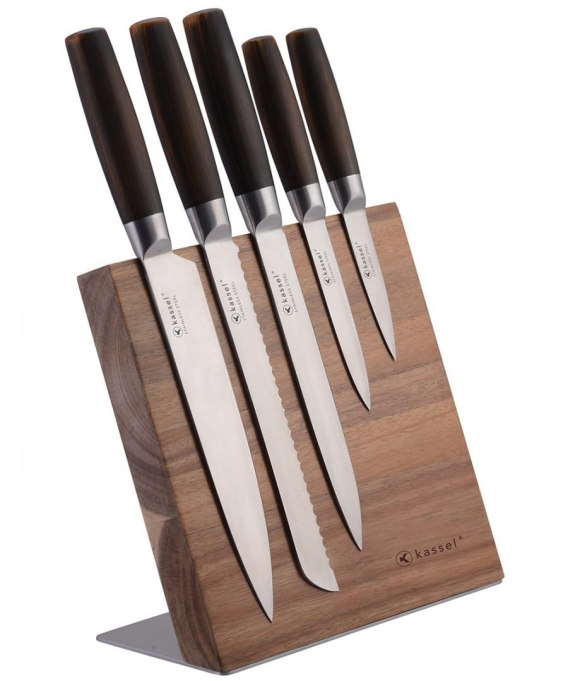 Zestaw 5 noży kuchennych na stojaku z naturalnego drewna akacjowego firmy KASSEL. Przeznaczone do porcjowania mięsa i ryb, krojenia pieczywa oraz obierania i siekania warzyw. Noże wykonane z wysokogatunkowej nierdzewnej stali. Ostrzone laserowo. Noże posiadają drewniane uchwyty.