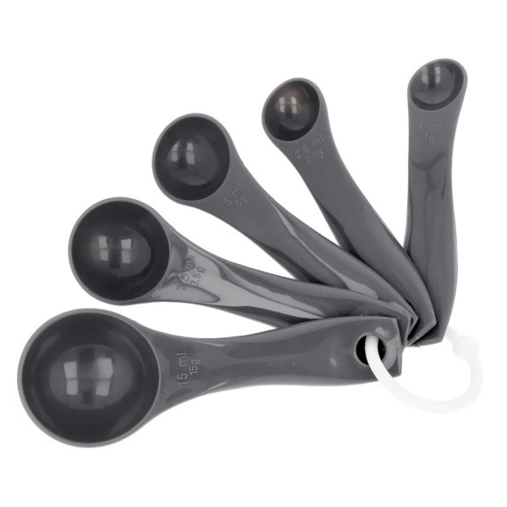 Łyżeczki pomiarowe z tworzywa sztucznego w kolorze szarym. Niezastąpione w kuchni podczas gotowania, pieczenia lub przygotowywania drinków.