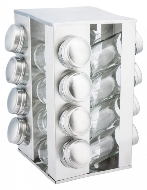 Zestaw 16 pojemników szklanych na obrotowym stojaku KINGHOFF wykonany ze stali nierdzewnej satynowej (INOX). Pojemniczki wykonane z grubego szkła, zamykane kapslem stalowym. Pod kapslem znajduje się zatyczka z dziurkami służąca do posypywania. Stojak obraca się na obrotowej podstawie wokół własnej osi 360 st.