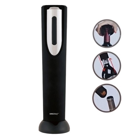 Korkociąg elektryczny do wina KINGHOFF którym bez problemu otworzysz każdą zakorkowaną butelkę. Zasilany na baterie i bezprzewodowy, co pozwala Ci swobodnie z niego korzystać, bez potrzeby podłączania go do źródła zasilania. Do zestawu dołączony jest również obcinacz do folii