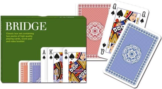 Klasyczne karty do gry w brydża Piatnika z serii "New Classic". W komplecie 2 talie oraz lista do zapisywania wyników, idealne do gry w brydża.