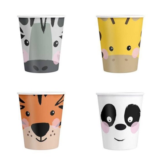 papierowe Kubeczki, z nadrukiem w zwierzątka. (żyrafa, panda, zebra, tygrys)