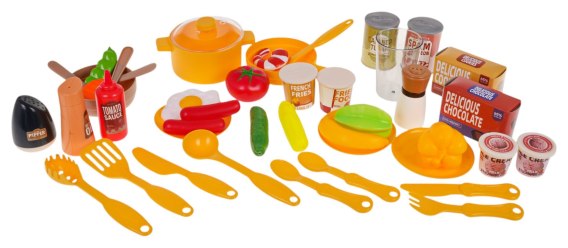 - kuchnia, - patelnia, - garnek z pokrywką, - miseczka, - widelec, - łyżka, - nóż, - łyżeczka, - nożyk, - widelczyk, - łopatka do mięsa, - łyżka do makaronu, - chochelka, - duży nóż, - 2 x kartonik na ciasteczka, - 3 x talerz, - solniczka, - pieprzniczka, - sos do sałatki, - ketchup, - kubek, - 2 x lody, - opakowanie z frytkami i hamburgerami, - 2 x konserwy, - atrapy produktów spożywczych: papryka, pomidor, liść sałaty, plasterek marchwi, plasterek papryki, krewetka, jajko sadzone, parówki, banan, groszek zielony, ogórek. |