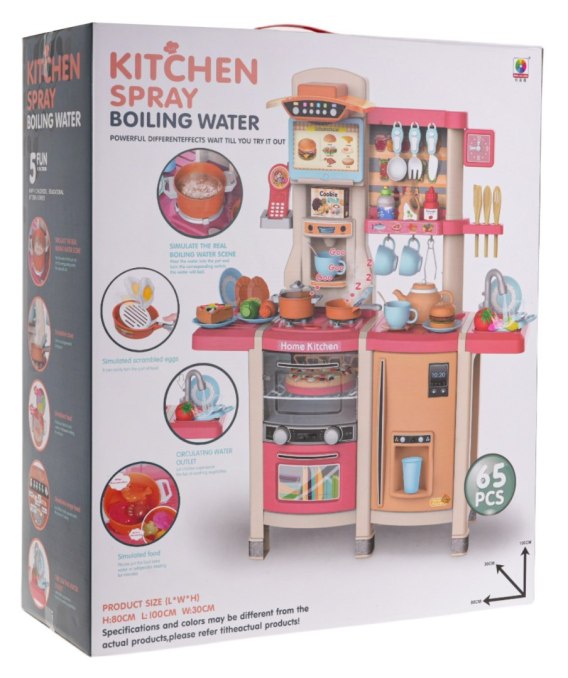 Interaktywna kuchnia z funkcją światła, dźwięku i kranikiem, z którego wydobywa się woda, a także mnóstwem akcesoriów, dla dzieci od 3-go roku życia. Kuchnia została znakomicie wykonana, z najlepszej jakości plastiku i jest w żywych kolorach zachęcających dziecko do zabawy. Na blacie kuchni znajduje się interaktywna płyta z palnikami. Po przekręceniu jednego z pokręteł słychać odgłosy gotowania, a drugiego, odgłosy smażenia. Odgłosom gotowania i smażenia towarzyszy podświetlenie palników. Z kranu faktycznie wypływa woda, jak w prawdziwym zlewie, dziecko będzie mogło umyć zabawkowe naczynia. W zestawie mamy też atrapę lodówki z otwieranymi drzwiczkami i dystrybutorem wody, otwierany piekarnik z efektami dźwiękowymi i świetlnymi, zmywarkę, ekspres do kawy, panel z wentylatorem oraz efektami dźwiękowymi i świetlnymi, telefonik z dźwiękiem i światłem oraz mnóstwo półeczek, na których ułożyć możemy atrapy produktów. Cały zestaw prezentuje się znakomicie. Zabawka zasilana jest bateriami typu 6 x AA 1,5 V (brak w zestawie) oraz 3 x AAA 1,5 V (brak w zestawie).