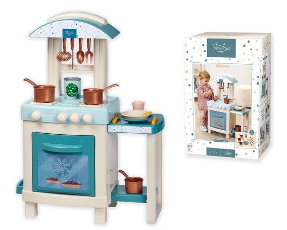 Kuchnia z piekarnikiem i 16 akcesoriami w tym rondelki, naczynia, sztućce. Do produkcji serii Vert Azur wykorzystywane są odpady po produkcji zabawek Ecoiffier.