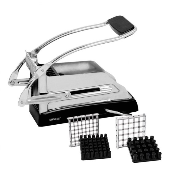 Maszynka do krojenia ziemniaków na frytki KINGHOFF. Krajarka składa się z korpusu wyposażonego w mocna przyssawkę oraz 2 wymiennych noży do krojenia. Maszynkę przytwierdza się do gładkiej powierzchni (stół, blat, parapet itp.) za pomocą przyssawki z dźwignią - uchwyt ten trzyma bardzo mocno.