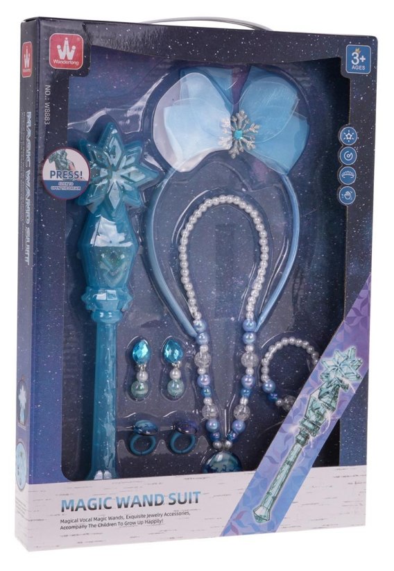 Znakomity, przepięknie wykonany zestaw małej księżniczki to propozycja dla dzieci od 3-go roku życia. Zestaw składa się z opaski do włosów, różdżki z efektami dźwięku i światła, korali, bransoletki, pierścionków i kolczyków. Różdżka zasilana jest bateriami typu 3 x AG13 (w zestawie).