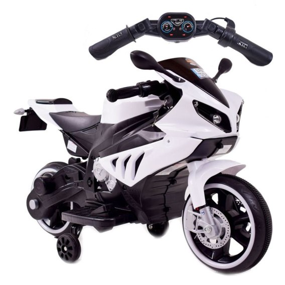 Panel z dźwiękami ( dźwięki odpalania motocykla) z wejściem USB i AUX i oświetlenie pojazdu ( światła oraz świecące koła) umili o urozmaici zabawą.