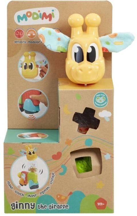 Żyrafa Ginny to sympatyczny towarzysz zabaw dla najmłodszych! To wesołe zwierzątko ma ciekawą i oryginalną szyję będącą teksturowanym klockiem- grzechotką oraz główkę z szeleszczącymi uszkami, dwa teksturowane klocki- tułów, kolorowy ogonek oraz żyrafie piszczące nóżki. Moduły z różnych zestawów Modimi można ze sobą łączyć, by dostarczyć dziecku jeszcze więcej doskonałej, kreatywnej zabawy!