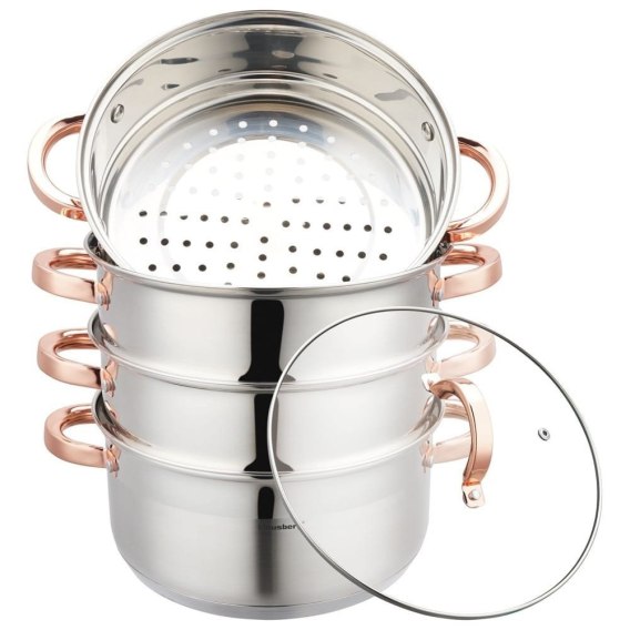 5 częściowy komplet garnków do gotowania na parze KLAUSBERG bazujący na garnku 5.0L / Ø24cm. Zestaw wykonany z wysokiej jakości stali nierdzewnej. Wykorzystana stal składa się z najlepszej jakości stopu powszechnie stosowanego w światowej klasy produktach, co gwarantuje jej wysoką odporność na korozję oraz bardzo dobrą wytrzymałość. Zastosowany materiał umożliwia szybkie podgrzanie potraw i przez dłuższy czas utrzymuje ciepło.
