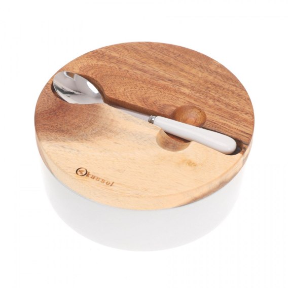 Porcelanowa cukiernica KASSEL w kolorze białym z pokrywą wykonaną z drewna akacjowego. W zestawie łyżeczka z porcelanową rękojeścią.