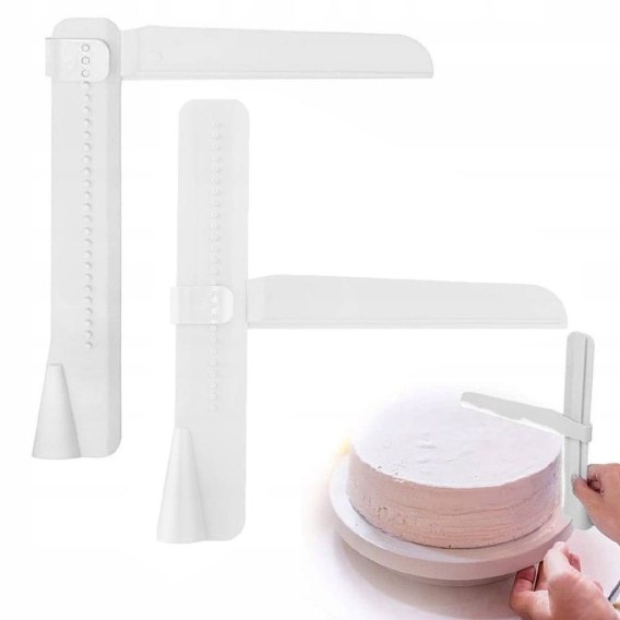 Regulowany skrobak do rozprowadzania i wygładzania kremu na torcie i innych wypiekach. Wygładzacz przesuwamy dookoła powierzchni tortu lub trzymając w miejscu obracamy paterą obrotową na której ułożony jest tort.