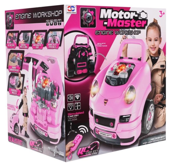 • Różowe autko z silnikiem do Naprawy dla dzieci 3+ Narzędzia + Interaktywny kokpit + Pilot Zestaw małego Mechanika