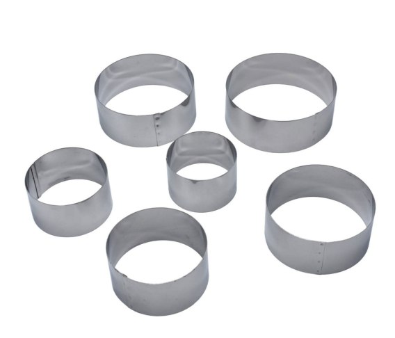 Stalowe obręcze do formowania tortów, ciast i potraw w kształcie pierścieni o 6 różnych średnicach.