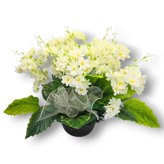 Kompozycje nagrobne z wysokiej jakości sztucznych kwiatów i roślin.