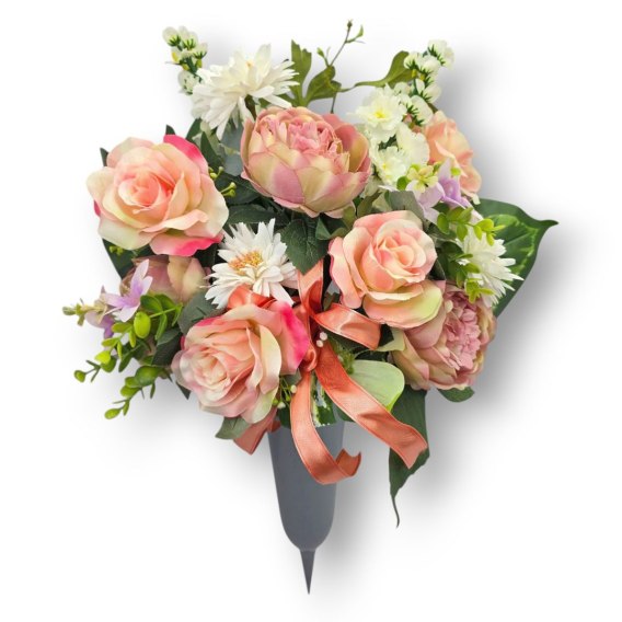 Estetyczny i trwały bukiet sztucznych kwiatów przeznaczony do wbijania w ziemię. Kompozycja umieszczona jest w wazonie na stabilnym plastikowym szpikulcu, co ułatwia umiejscowienie bukietu przy grobie, kapliczce lub krzyżu. Wazon jest obciążony betonem. Naturalny wygląd kwiatów oraz gustowny dodatek w postaci wstążki sprawiają, że dekoracja prezentuje się elegancko i schludnie przez długi czas - niezależnie od warunków atmosferycznych.