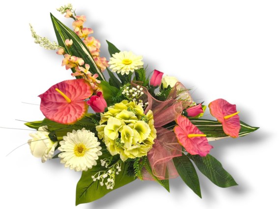 Kompozycje nagrobne z wysokiej jakości sztucznych kwiatów i roślin.