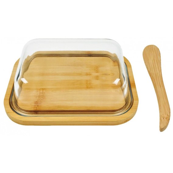 Szklana maselniczka z bambusową pokrywą. W zestawie konturowany nożyk do smarowania wykonany z drewna bambusowego. Pokrywa z bezbarwnego szkła borokrzemowego (nie zawiera BPA i ołowiu). Bambusowa pokrywa jest odporna na zarysowania i może służyć jako deseczka do krojenia masła czy serów.