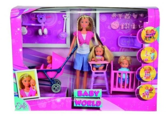 Lalka Steffi z trójką dzieci, z łóżeczkiem, krzesełkiem, jeździkiem i wieloma akcesoriami.