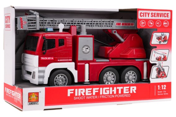 Interaktywna straż pożarna z funkcją dźwięku i światła, oraz lejącą się wodą dla dzieci od 3-go roku życia. Wóz strażacki został wykonany z najlepszej jakości materiałów w żywych kolorach. Posiada ruchome elementy takie jak regulowana drabina w górę i w dół, a także wydłużana i skracana. Na końcu drabiny znajduje się platforma z końcówką węża strażackiego, z którego leci woda. Na początku przyczepy, umieszczony jest zbiornik na wodę. Po napełnieniu zbiornika wodą wystarczy przycisnąć przycisk znajdujący się na górze zbiorniczka a poleci woda. Na dachu kabiny wozu strażackiego znajdują się przyciski, po naciśnięciu, na które usłyszymy sygnał syreny, klakson lub odgłos odpalania pojazdu. Odgłosom towarzyszy miganie światełek na dachu pojazdu. Pojazd posiada gumowe opony i napęd frykcyjny na przedniej osi. Zasilany jest bateriami typu 3 x AG13 (w zestawie).