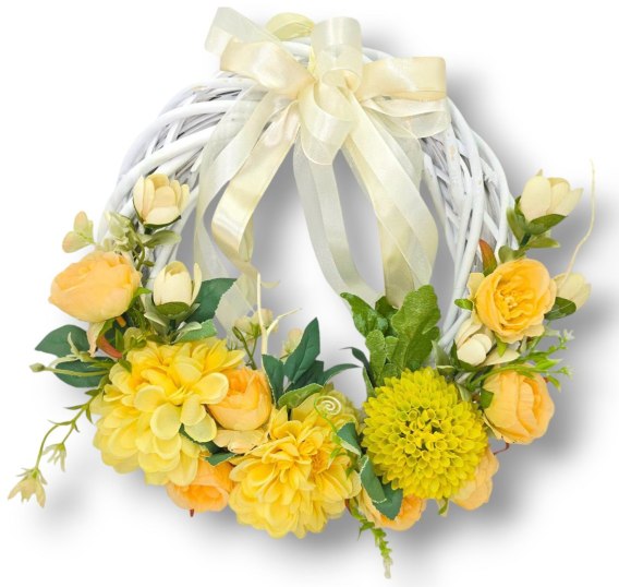 Wprowadź do swojego wnętrza odrobinę uroku i świeżości dzięki wyjątkowemu wiankowi dekoracyjnemu! Subtelna kompozycja kwiatów, zieleni i białej plecionki sprawia, że będzie on doskonałą ozdobą zarówno do wnętrz, jak i na drzwi wejściowe. Idealny jako całoroczna dekoracja, a także na specjalne okazje, np. święta, wesela czy jako stylowy prezent.