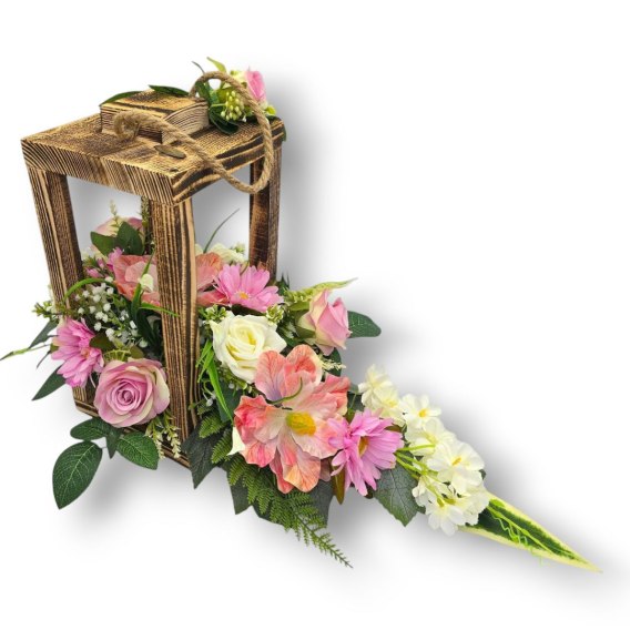 Dodaj wyjątkowy akcent do miejsca pamięci dzięki tej pięknej kompozycji w drewnianym lampionie. Stroik zachwyca żywymi kolorami i starannym wykonaniem - symbolizując pamięć oraz szacunek.