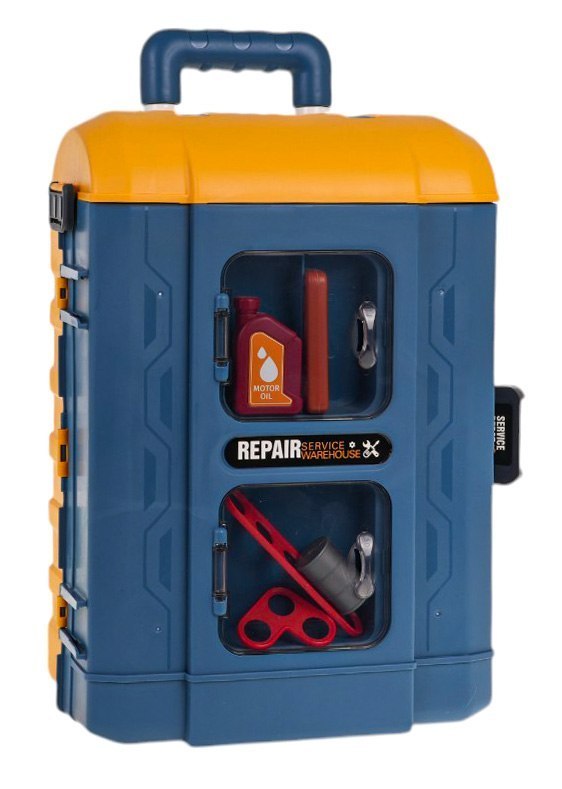 - części konstrukcyjne warsztatu, - wkrętarko-wiertarka, - wymienne bity do wiertarki: płaski i krzyżakowy, - śrubokręt, - młotek, - klucz płasko-oczkowy, - klucz nasadowy podwójny, - kombinerki, - piła ręczna, - drewienko, - drewienko do wkręcania, - 2 x elementy do wkręcania, - 2 x element do wkręcania w kształcie trójkąta, - kanister, - 5 x śruba, - nasadka, - kołek rozporowy, - beczka z olejem, - 3 x koło zębate, - naklejki dekoracyjne. |